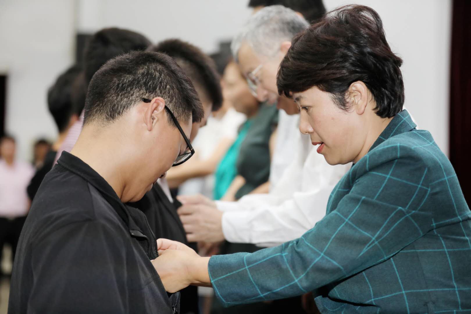 与会的教师代表还为新生代表佩戴了校徽,新生代表向2018级新生班主任老师献上鲜花。有助于增进师生间的交流互动,使新生能够尽快在心里产生家的归属感和亲切感,以便更快、更好地适应老员工活,明确大学学习目标,同时也为未来的学习生活工作奠定了良好开端、打下了坚实基础。