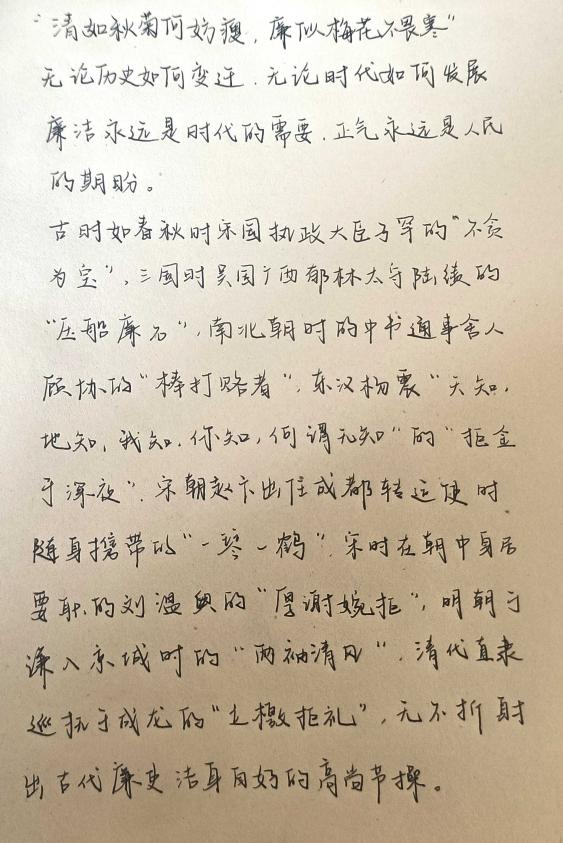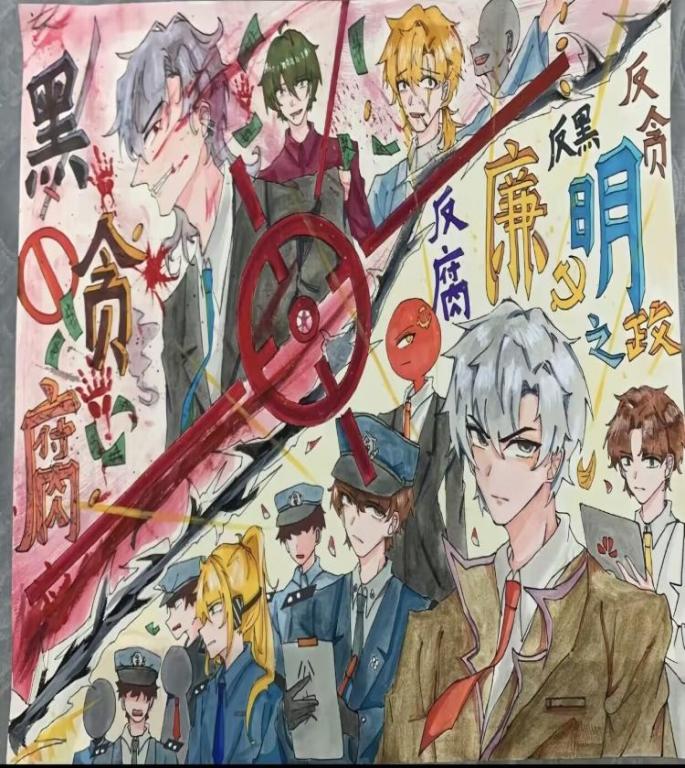 活动通过征集廉政文化主题的书法、绘画作品,引导老员工发扬党的优良传统,营造风清气正的校园氛围吴若萌肖家伟刘旭阳、任宏业同学从中国传统优秀文化和特色先进文化中寻找灵感,用生动的笔触将廉洁正气描绘在纸上。