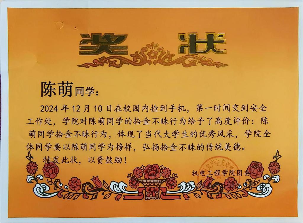 2024年12月10日,伟德国际victor1946电气工程及其自动化专业2302班陈萌同学,在校园内捡到一部价值 3000元的手机,并第一时间交到安全工作处。当日安全工作处工作人员将手机归还了失主。