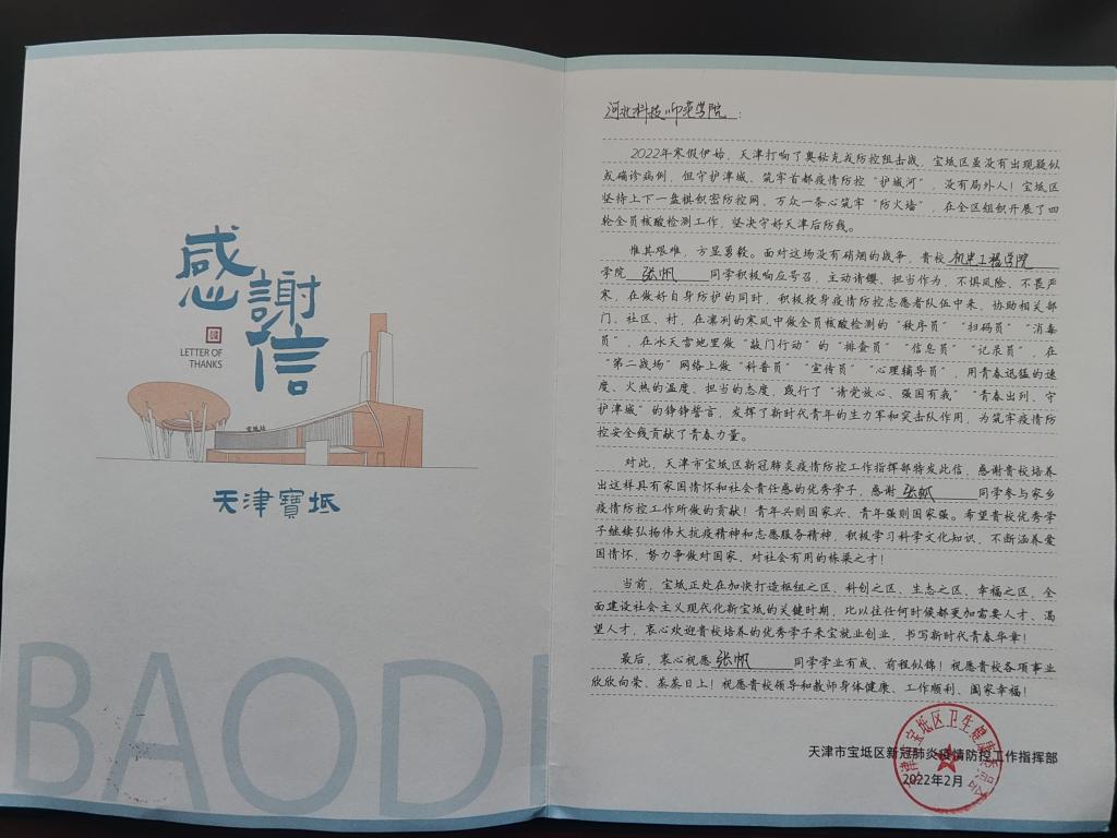 近日,伟德国际victor194619机制张帆同学因在属地积极投身疫情防控志愿者队伍,天津市宝坻区疫情防控指挥部特发来感谢信。